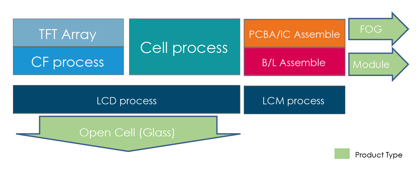 後段模組組裝製程是將Cell製程後的玻璃與其他如背光板、電路、外框等多種零組件組裝的生產作業